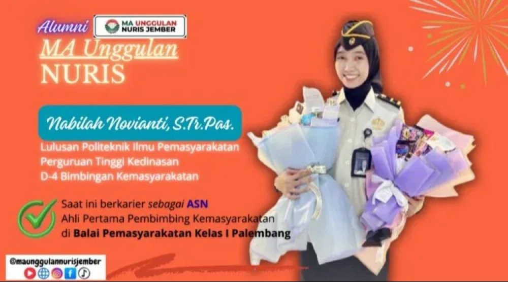 Pesantren Nuris – Jadi yang pertama di Pesantren Nuris Jember, khususnya di MA Unggulan Nuris, Nabilah Novianti, layak dinobatkan sebagai santri membanggakan dan inspiratif. Pasalnya, ia menjadi yang pertama menembus ketat dan panjangnya seleksi kuliah kampus kedinasan, Politeknik Ilmu Pemasyarakatan (Poltekip) di bawah naungan Kementerian Imigrasi dan Pemasyarakatan (Kemenimipas) RI.