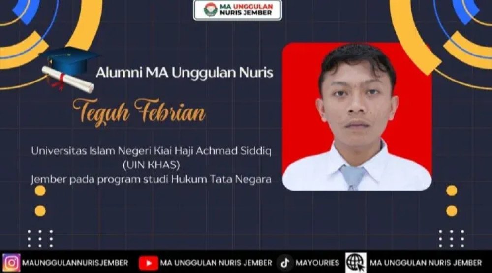 Pesantren Nuris — Setiap perjalanan menuju masa depan memiliki cerita dan prosesnya masing-masing. Begitu pula dengan perjalanan Teguh Febrian, salah satu alumni MA Unggulan Nuris Jember tahun 2025 yang kini tengah melanjutkan pendidikan di perguruan tinggi. Dengan tekad yang kuat serta keinginan mendalam untuk menekuni dunia hukum, ia kini menapaki langkah baru sebagai mahasiswa di Universitas Islam Negeri Kiai Haji Achmad Siddiq (UIN KHAS) Jember pada program studi Hukum Tata Negara.
