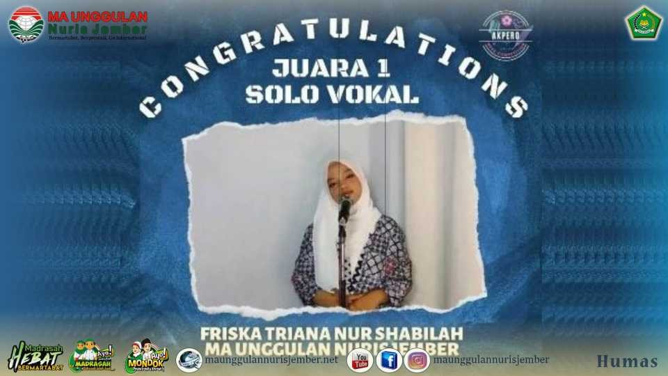 Sukses Juara 1 Solo Vokal Tingkat Nasional, Prestasi Pelajar MA Unggulan Nuris di Ajang Akpero Week Competition 2022